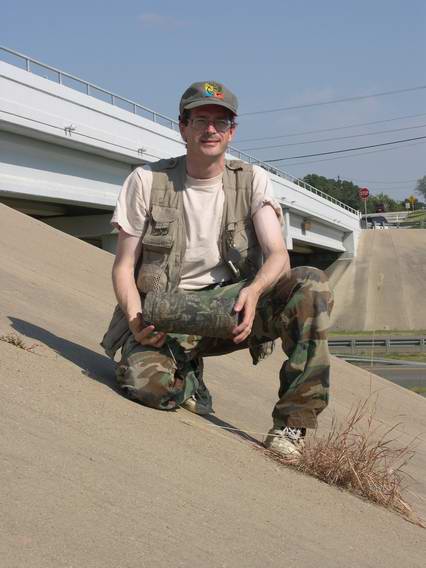 Clover Leaf in Woodway, near Waco, Texas. I really had intended to find an Austin cache by one of the respected locals, but when I get the chance to go out of town, I like to visit caches that I wouldn't normally have a chance to visit. I had spent this day working at the law firm just a few yards from the cache, and couldn't resist the temptation to go find it after work. (No, I didn't go to work dressed like that: this was a case where it helped to have a trunk full of geocaching contingency items.)